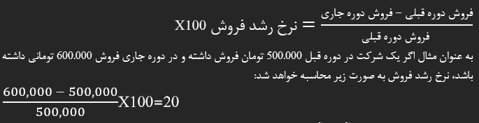 به عنوان مثال اگر یک شرکت در دوره قبل 500.000 تومان فروش داشته و در دوره جاری فروش 600.000 تومانی داشته باشد، نرخ رشد فروش به صورت زیر محاسبه خواهد شد: